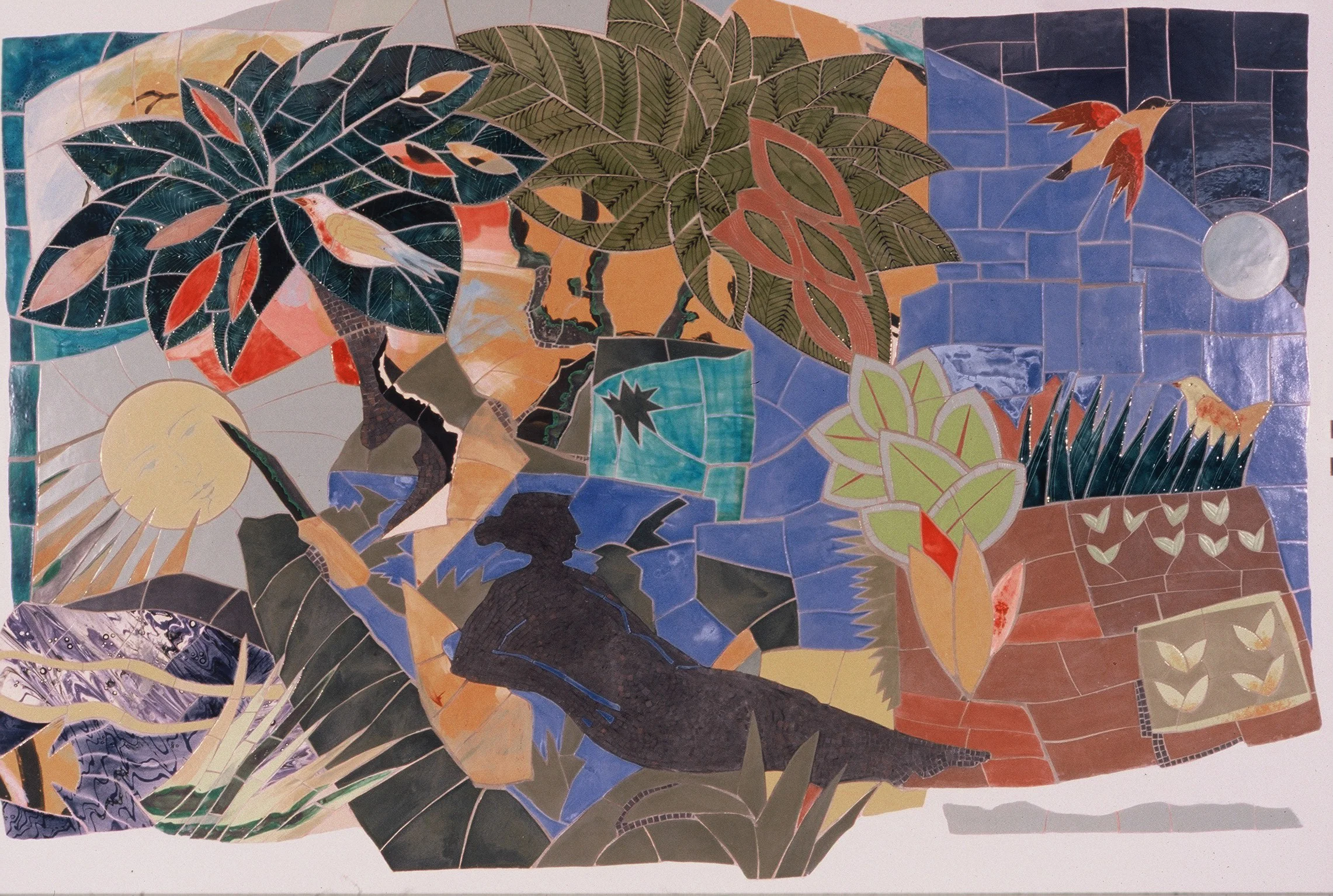 Inspired by the beautiful courtyard gardens in this hospital, this ceramic mosaic mural was a collaboration with Nicholas Martin.